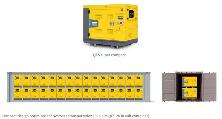 In porttitor super compacto QES exemplar designatum est vecturam efficacissimam concedere. Accommodare potes ad 30 unitates Atlantis Copco QES 20 in 40 pedum continente, maxime pro 20kVA potentiae Atlantis Generantis in foro! Significat onerariam optimized CO2 emissiones redactas et gratuita operativa, quae consequitur in inferiore Custus Occupationis (TCO). Eius environmentally- amicae consilium facit id specimen pro repositione transmarinae, reducendo exponentialiter vestigium in-situm.