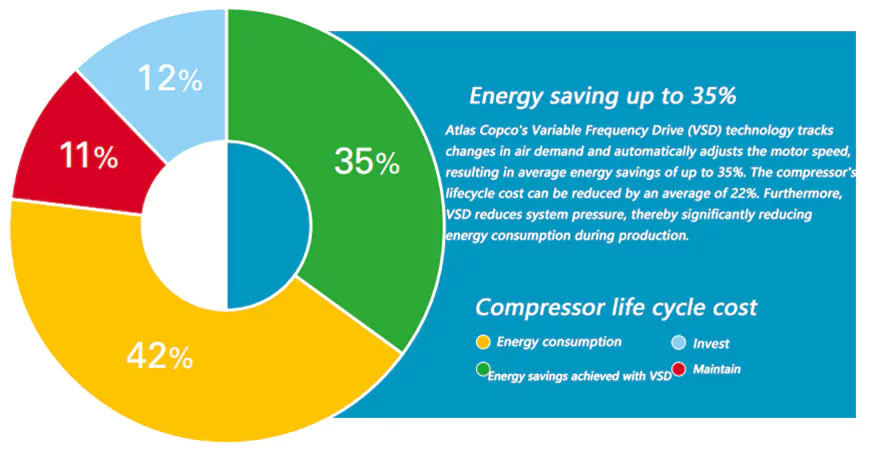 Energy consummatio rationum super 80% totius vitae cycli sumptus olei-liberi Screw Aeris Compressoris. Praeterea electricitas in aere compresso rationes productionis adhibita supra 40% of officinas totalis electricitatis gratuita est. Ad impensas industrias redigendas, Atlas Copco Coegi variabilis Frequency Coegi (VSD) technologiae in compressione aeris industriae auctam fecit. VSD non solum significant quantitates energiae servat, sed etiam ambitum futuris generationibus tuetur. Propter continuam obsidionem in hac technologia, Atlas Copco latissime potest offerre compressores VSD integralis in mercatu.