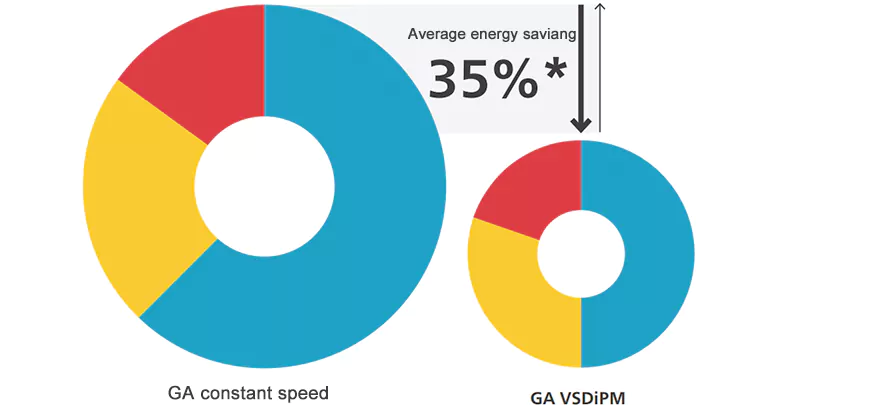 Compressores series maxime efficiens VSDiPM nisi mediocris partis usque ad 35%* energiae comparatae compressores acti certae velocitates